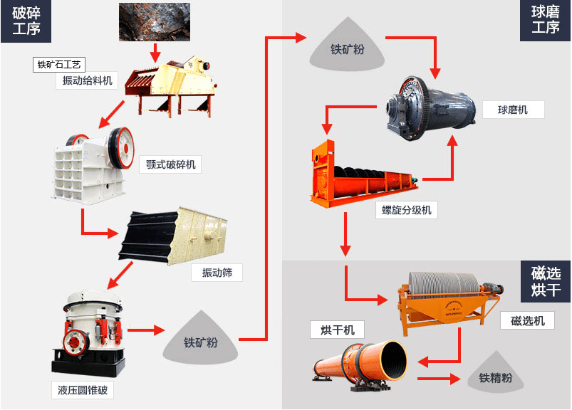 铁矿石是钢铁生产企业的重要原材料,天然矿石(铁矿石)经过破碎、磨碎、磁选、浮选、重选等程序逐渐选出铁。